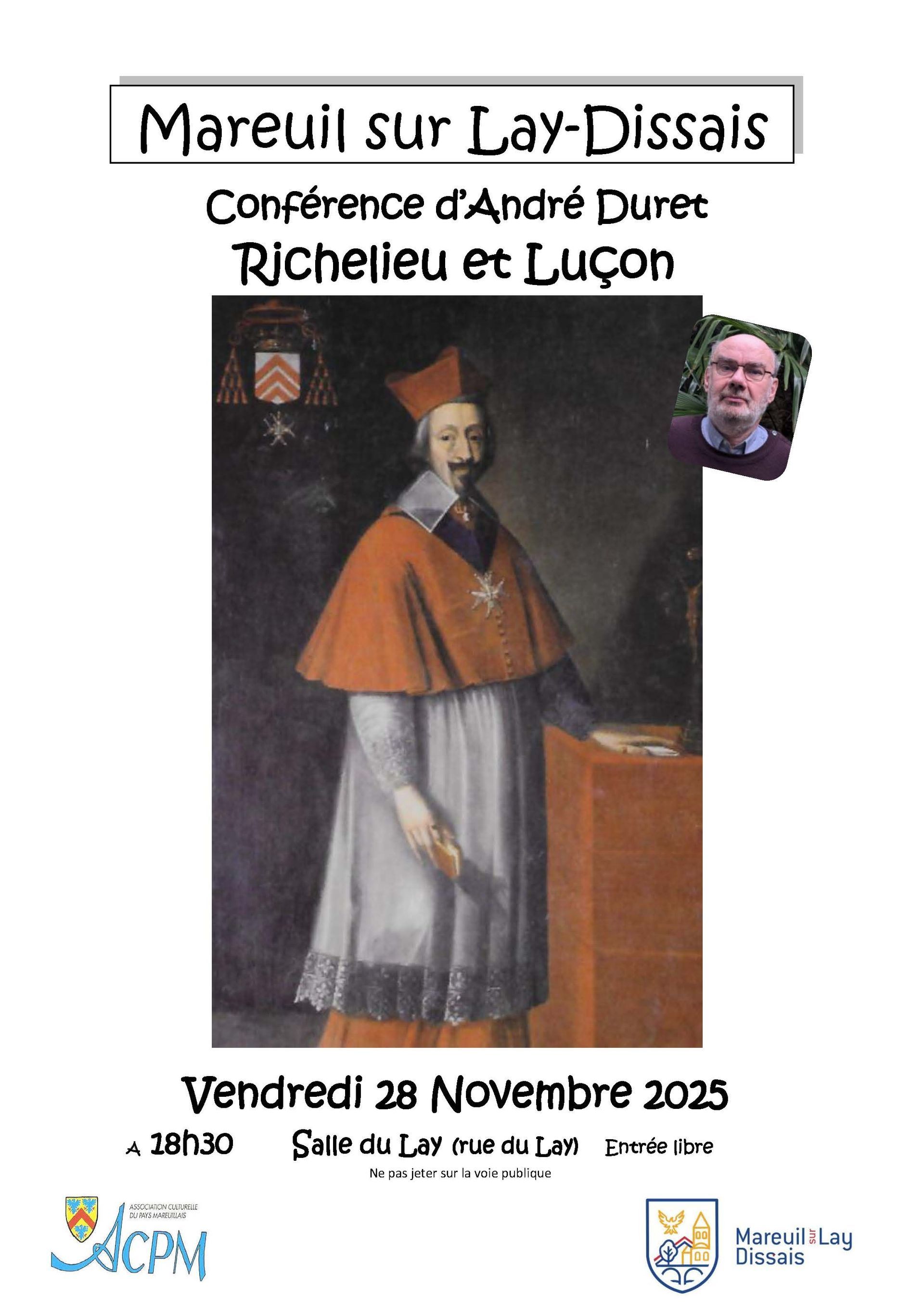 André Duret, président de l'ACPM, présentera une conférence en lien avec notre précédent bulletin "Richelieu et Luçon". De l'arrivée de Jean-Armand du Plessis à Luçon aux traces laissées dans la cité épiscopale par le cardinal, André Duret vous présentera le contexte particulier de son arrivée à Luçon et des nombreux souvenirs encore présents pour bien montrer sa survivance dans le collectif luçonnais.